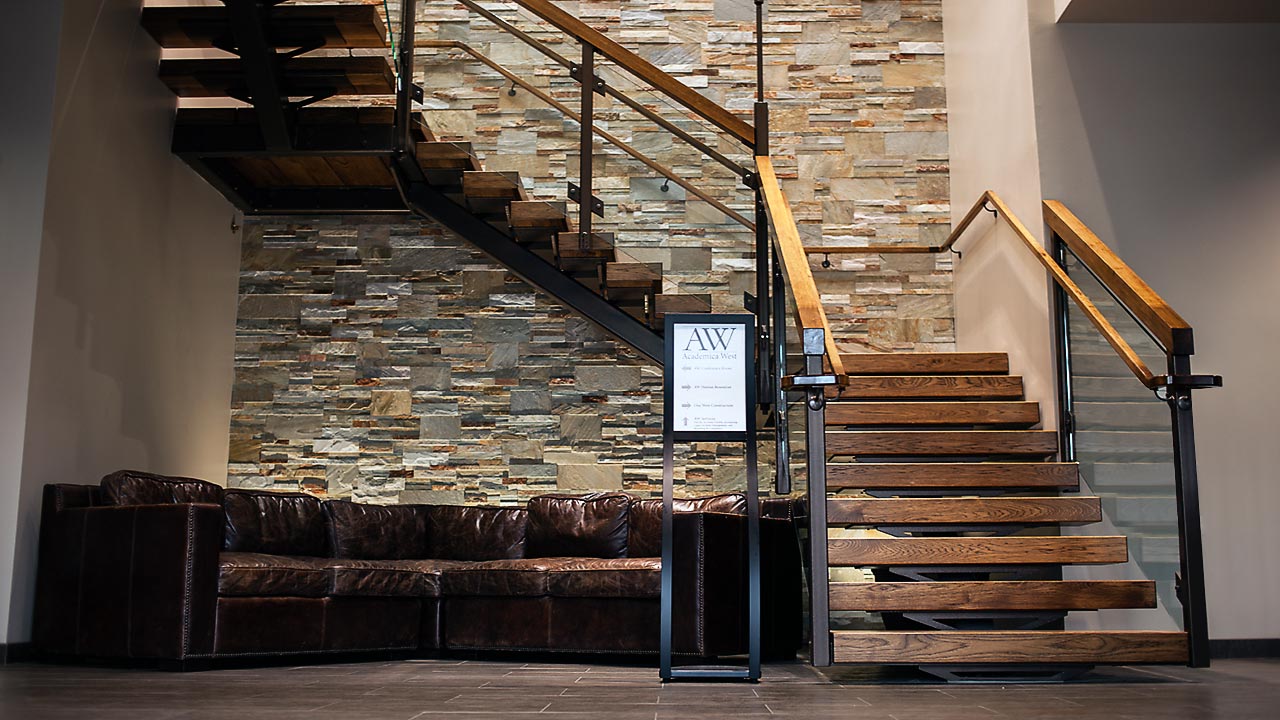Since outgrowing their current office space, Academica West needed a new facility that would accommodate their expanding staff and other business needs. Walking through the main entrance you are greeted by a beautiful suspended stairway with recessed surround lighting and large overhead coffered ceiling with custom skylight. Similarly beautiful and innovative architecture and structural engineering continue throughout the interior and exterior of the building to offer a visually appealing experience around every turn.