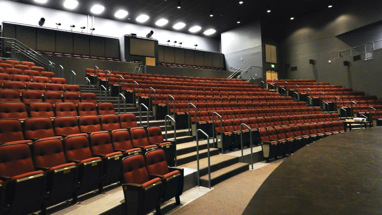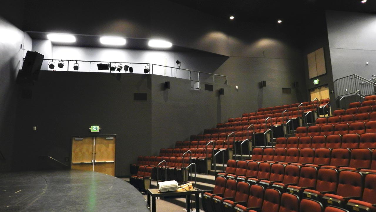 Auditorium theater includes 412 stadium-style seats, a 46’x18′ proscenium, fly loft, two on-stage quick-change rooms, and an orchestra pit.